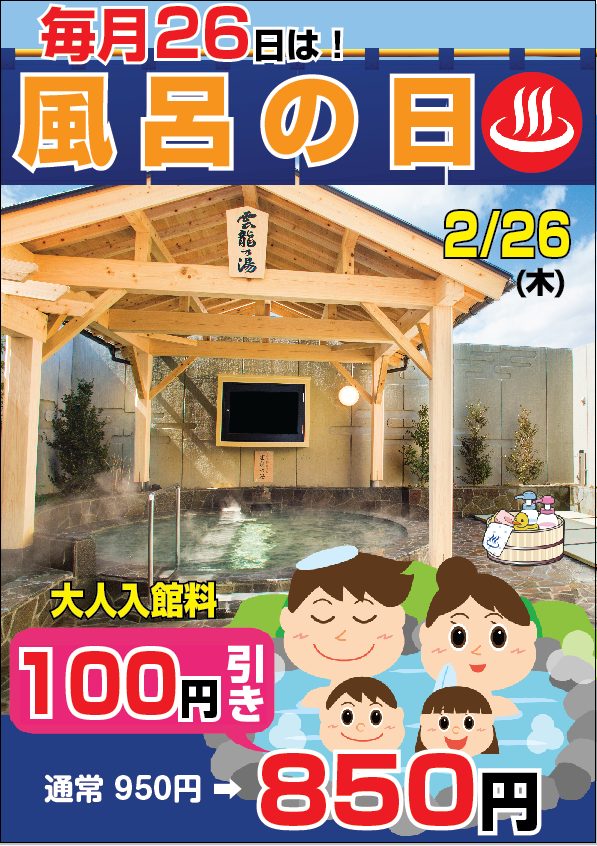 - 2026年2月のイベントカレンダー 今月のイチオシは 20日 続きを読む - ミュージックロウリュウサウナ「爆風房」と岩盤浴が650円でご利用できます♪ 2024/06/30
