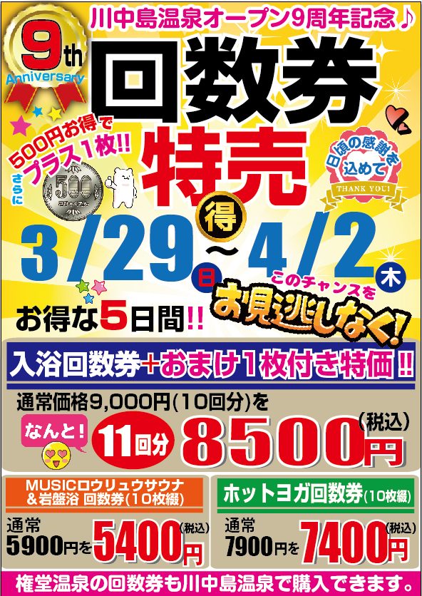 回数券特売のお知らせ 2026/03/15 NEW - 3月29日~4月2日まで回数券特売を行います。 今回は、周年 続きを読む