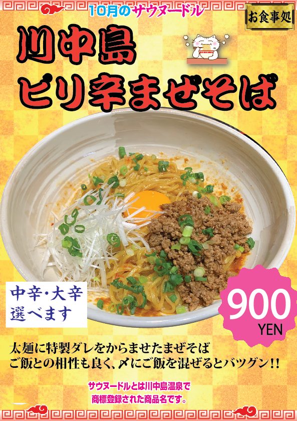 投稿日: 2025年8月31日2025年9月30日 投稿者: 川中島温泉広報担当10月のサウヌードル『ピリ辛まぜそば』 太麺と特製ダレが見事にマッチ! ご飯との相性も良く、〆にご飯を混ぜるとバツグン!!