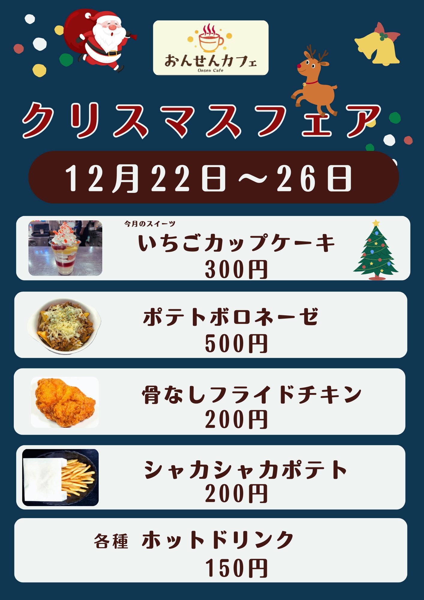 投稿日: 2025年12月22日 投稿者: 川中島温泉広報担当おんせんカフェ『クリスマスフェア』開催🔔 22日~26日まで別館おんせんカフェにてクリスマスフェアを開催。 いつもより大変お買い求め安くなっています!