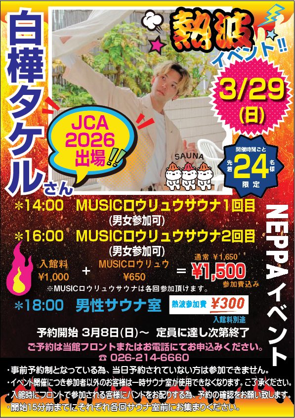 投稿日: 2026年3月5日3/29 白樺タケルさんイベント開催! 川中島温泉9周年記念イベント 『白樺タケルさん熱波イベント』開催します! 二年ぶりに白樺タケルさんが川中島温泉に登場です。 先着、予約制となります。 皆さまのご参加お待ちしております。