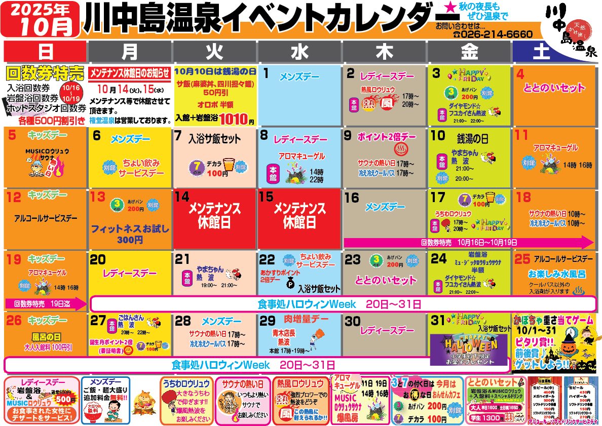 10月のイベントカレンダー 毎月のサウナイベントはもちろん、 10月10日はビッグイベント「銭湯の日」 やまちゃんによる熱波、今回はミュージックサウナでもおこないます😊 さらに入館料+岩盤浴MUSIC料金が1,010円! その他にもイベント盛りだくさんで、お待ちしております!